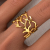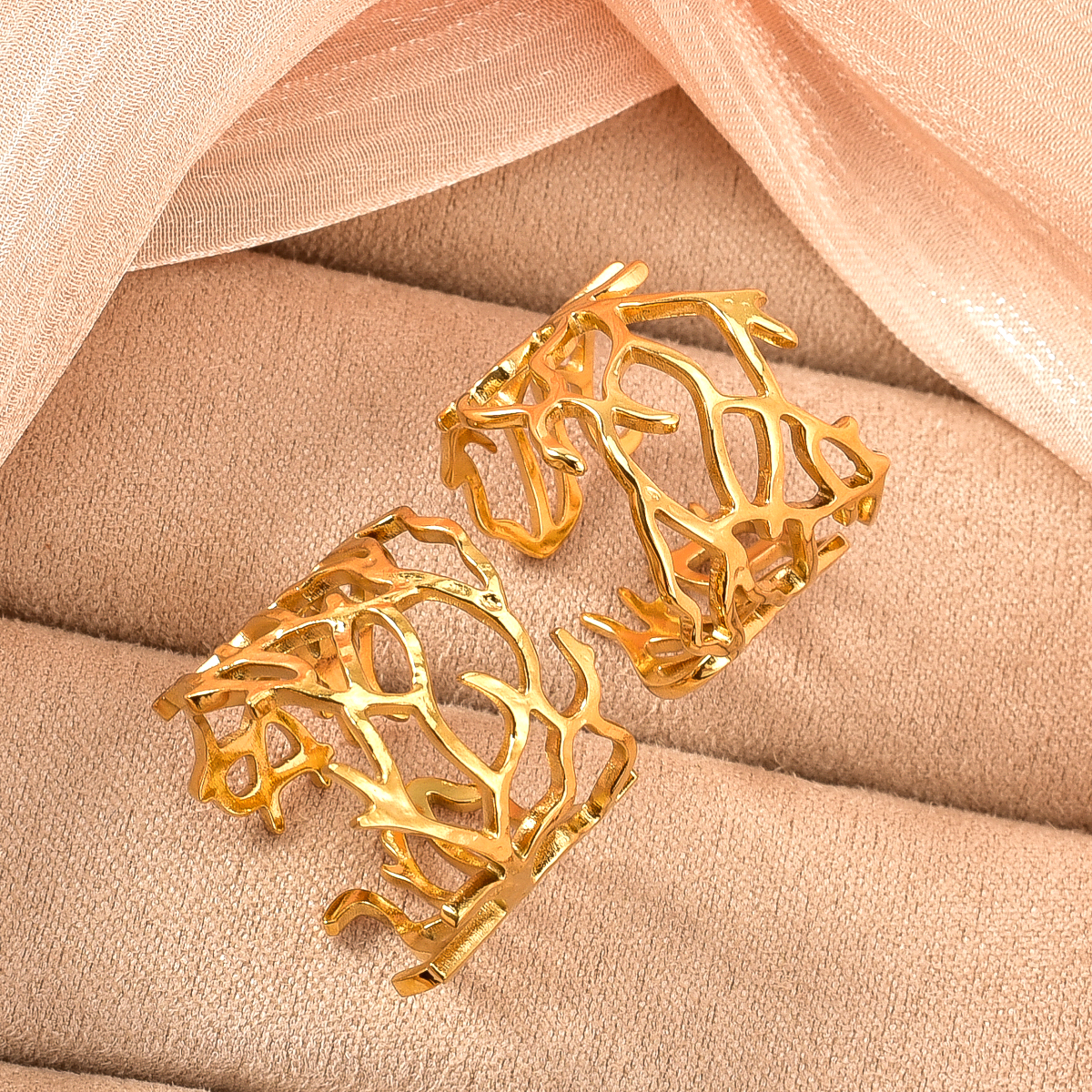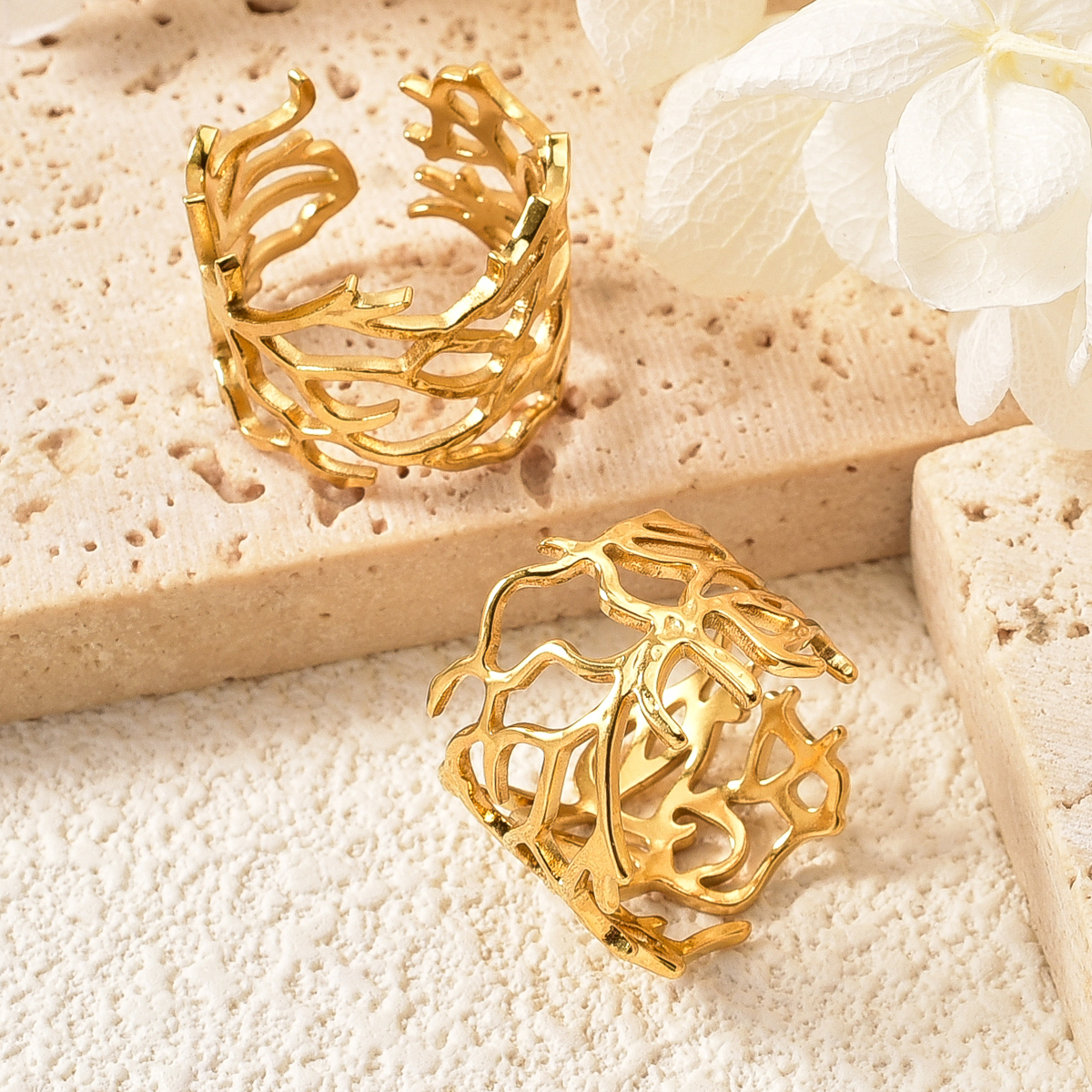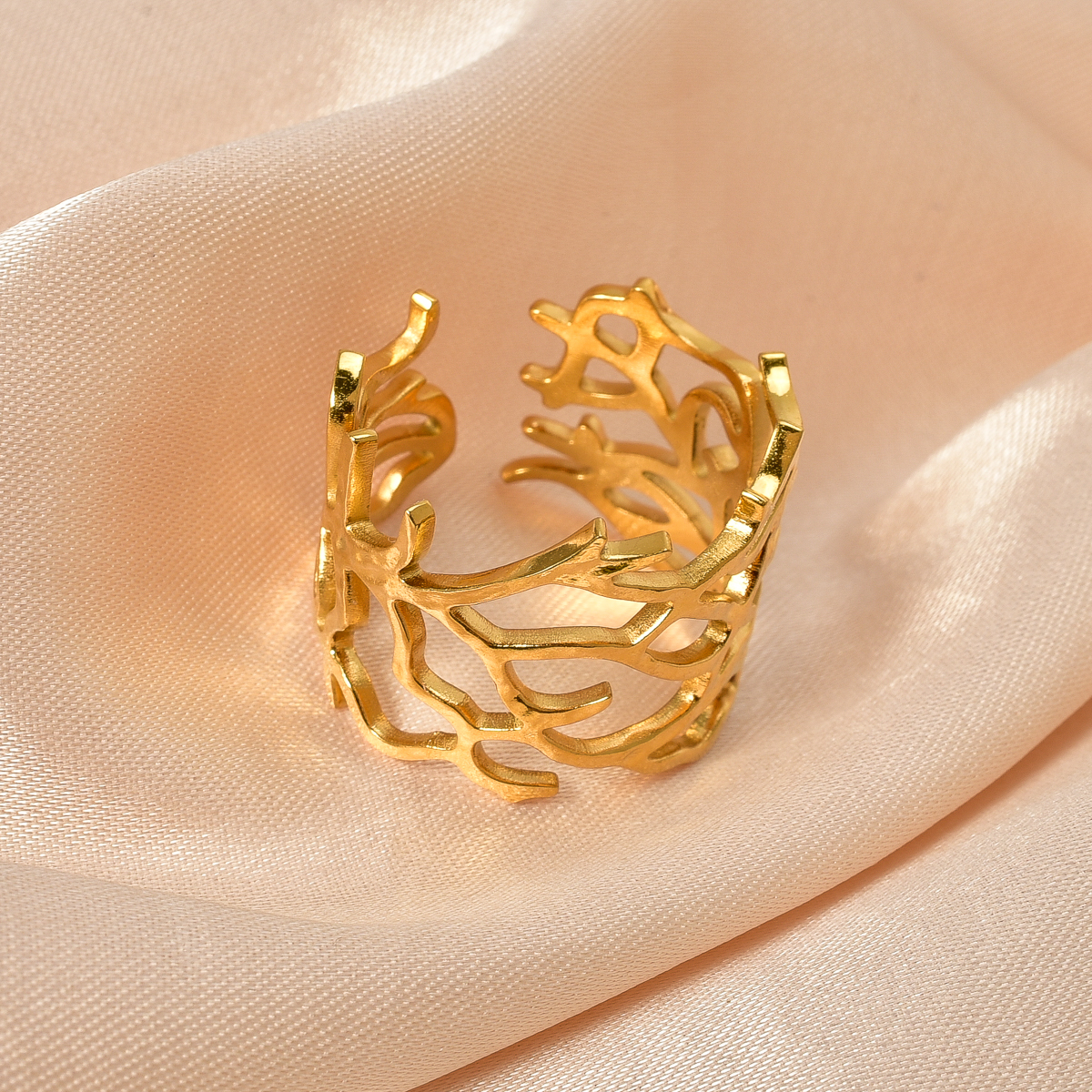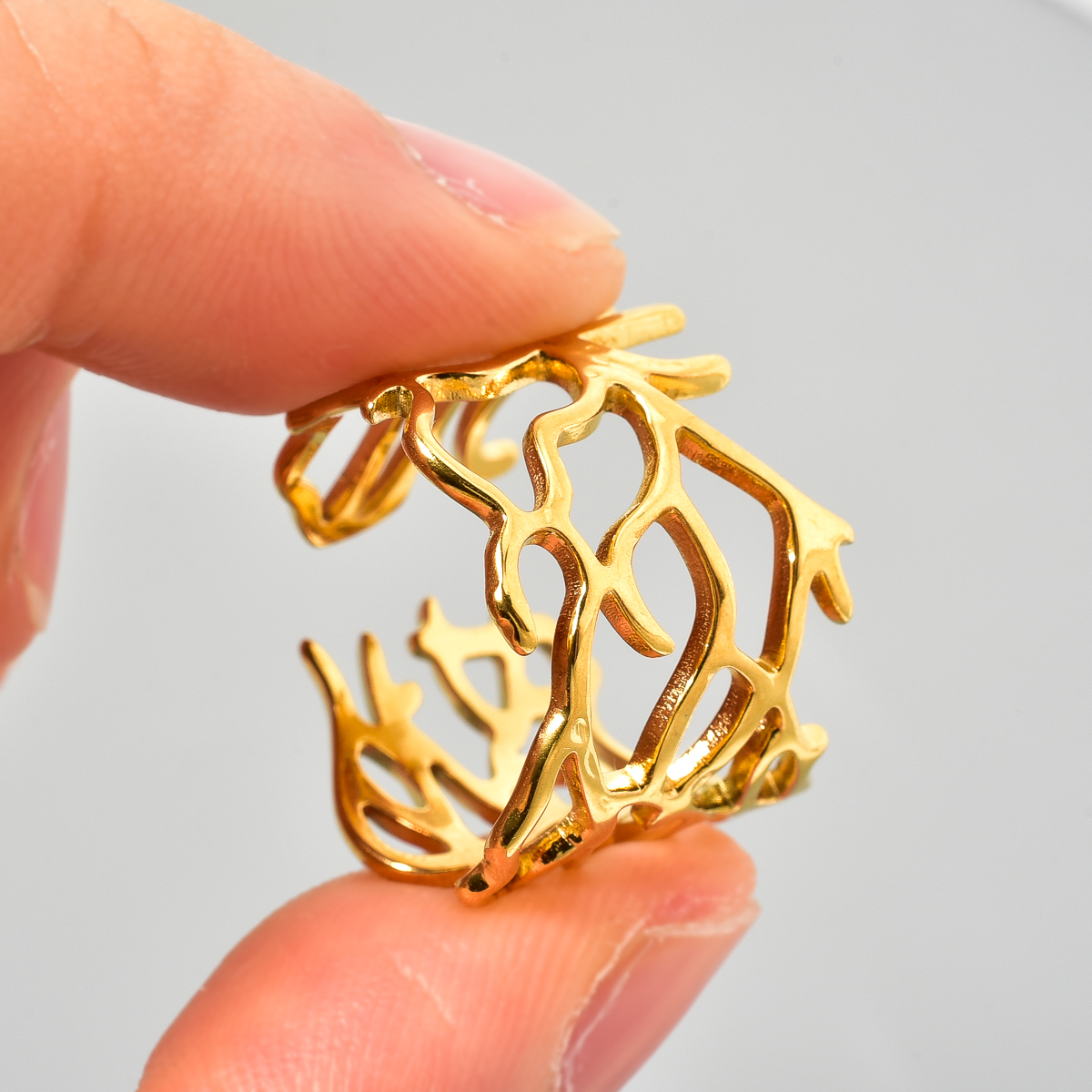 This is a golden ring with a unique hollow-out design. The shape is naturally stretchy and flexible coral. The lines are winding and staggered, presenting a casual and artistic form. The golden luster makes it delicate and luxurious. The opening style is not only convenient to wear, it also adds a bit of flexibility and personality to the whole, which is very suitable for creating a unique wearing style and adding bright spots to the hand modeling.