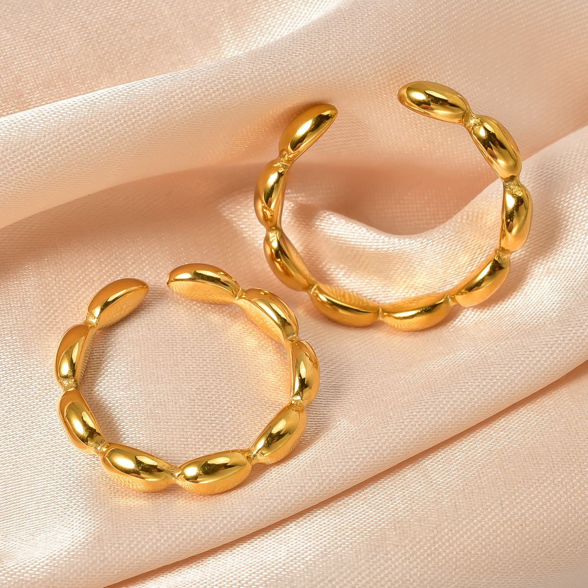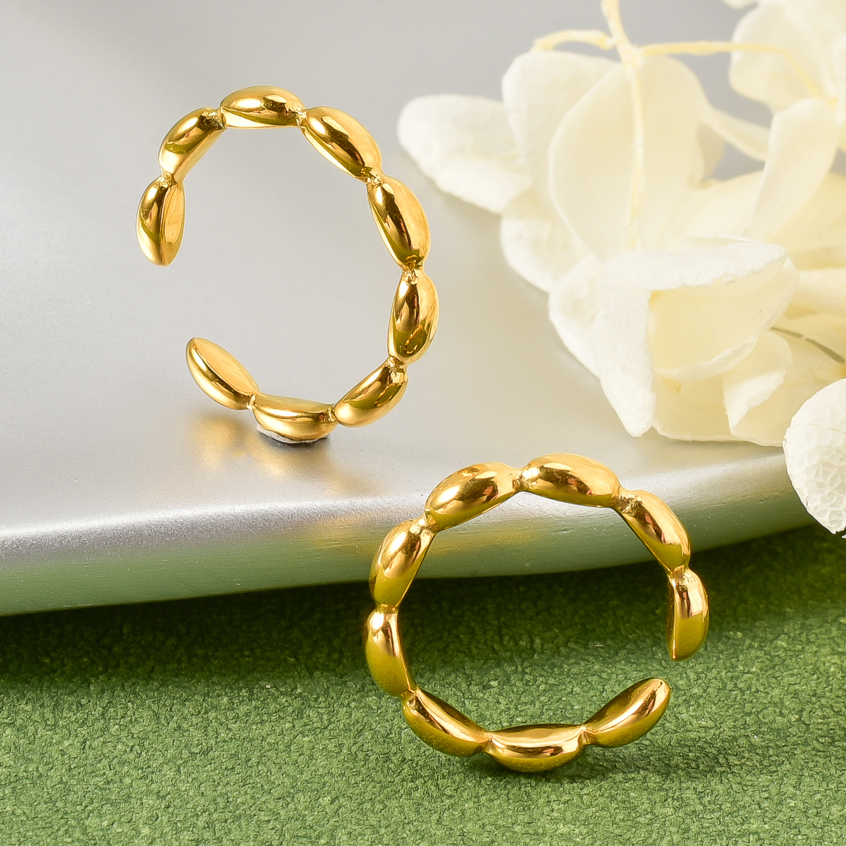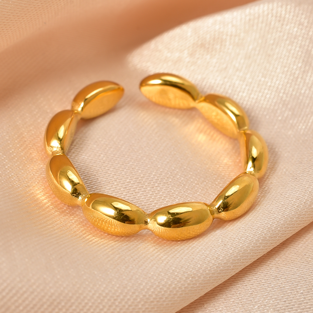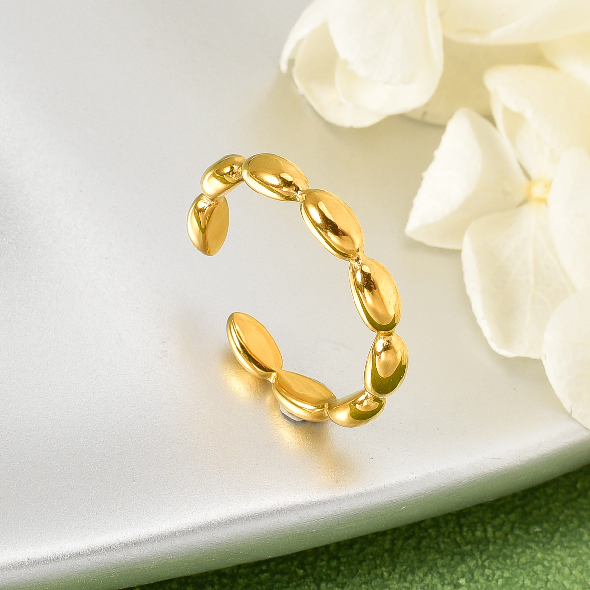 This is a golden ring with simple and exquisite overall design. It is made up of several Round Oval elements connected in sequence, and its shape is like a series of full beans, with smooth lines and rich texture. The golden color makes it exude elegant and luxurious atmosphere, and the opening style is convenient to wear. At the same time, it also adds a little flexibility to the ring, which is suitable for matching various styles of clothing, it can add a touch of bright color to the hand shape.