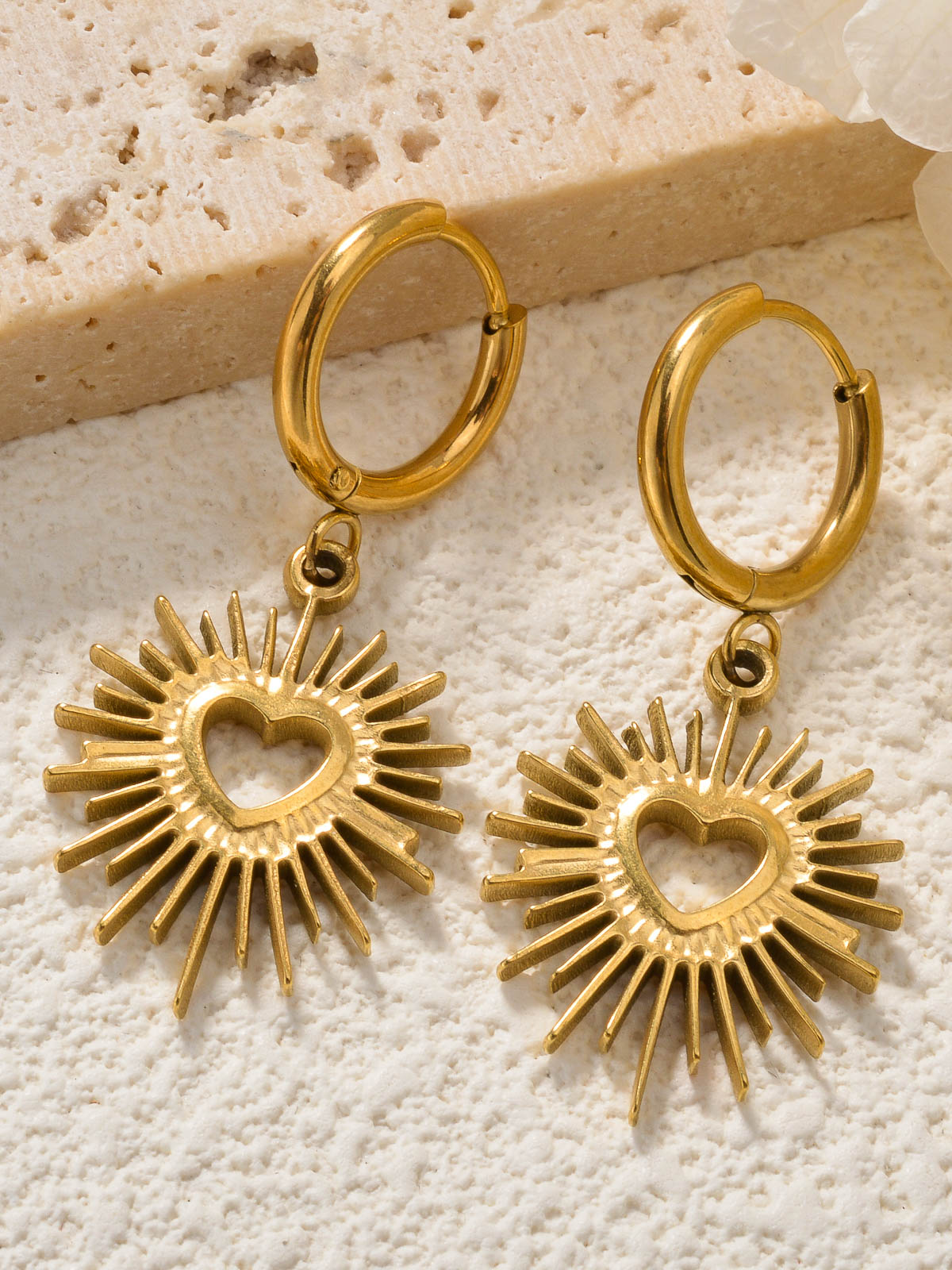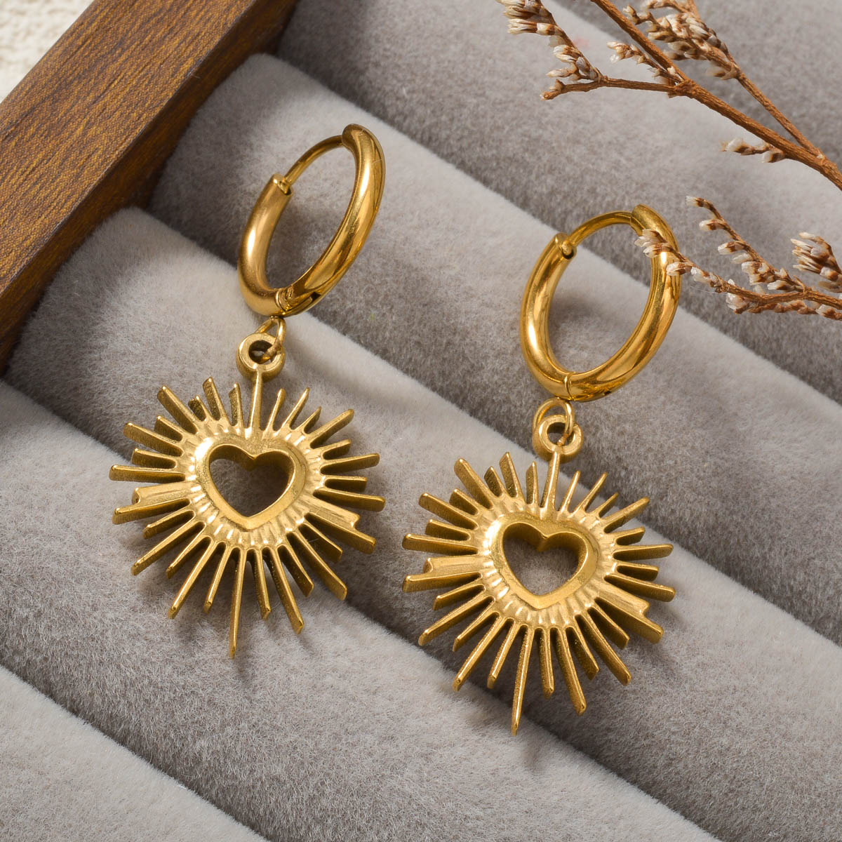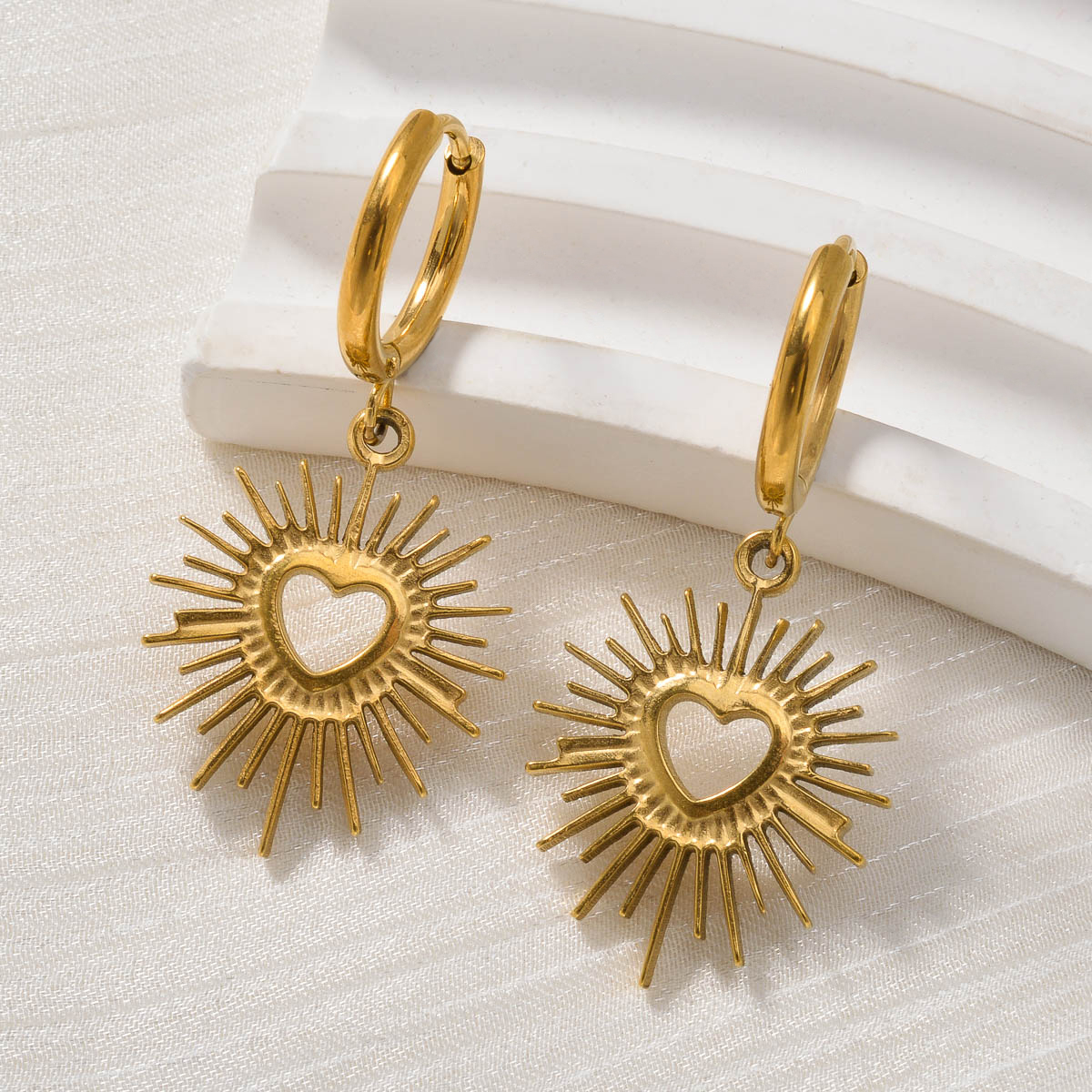 Based on the golden ring ear buckle, a chic pendant is hung below. The main body of the pendant is shaped like the sun's light, with lines diverging outward and full of vitality. There is also a hollow-out heart-shaped design embedded in the middle, which skillfully combines the enthusiasm of sunshine with the gentleness of love, the overall style is exquisite and full of design sense, which can add elegance and romance to the wearer.