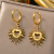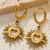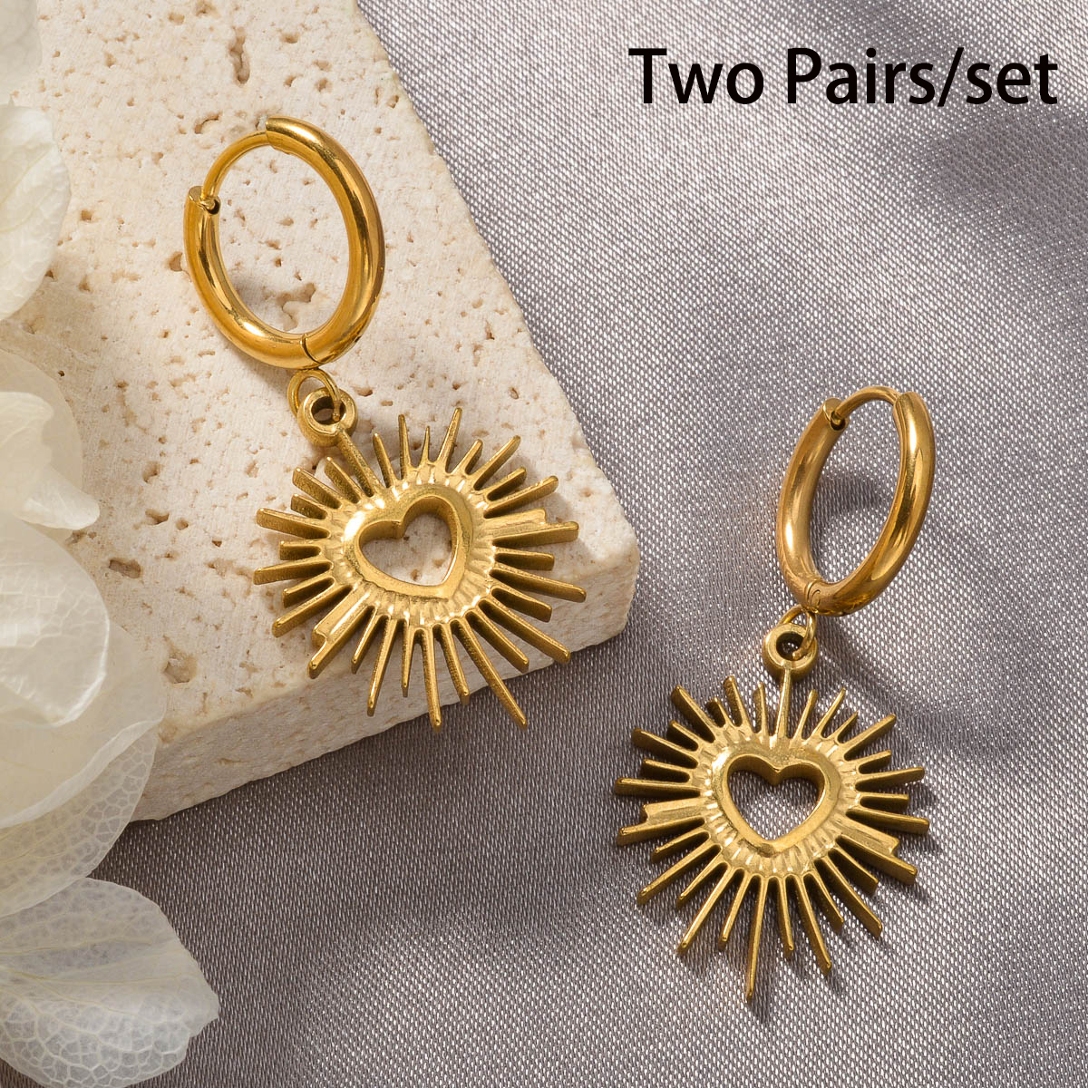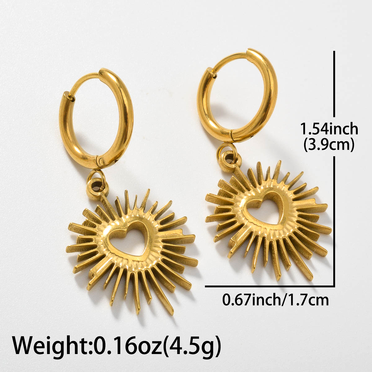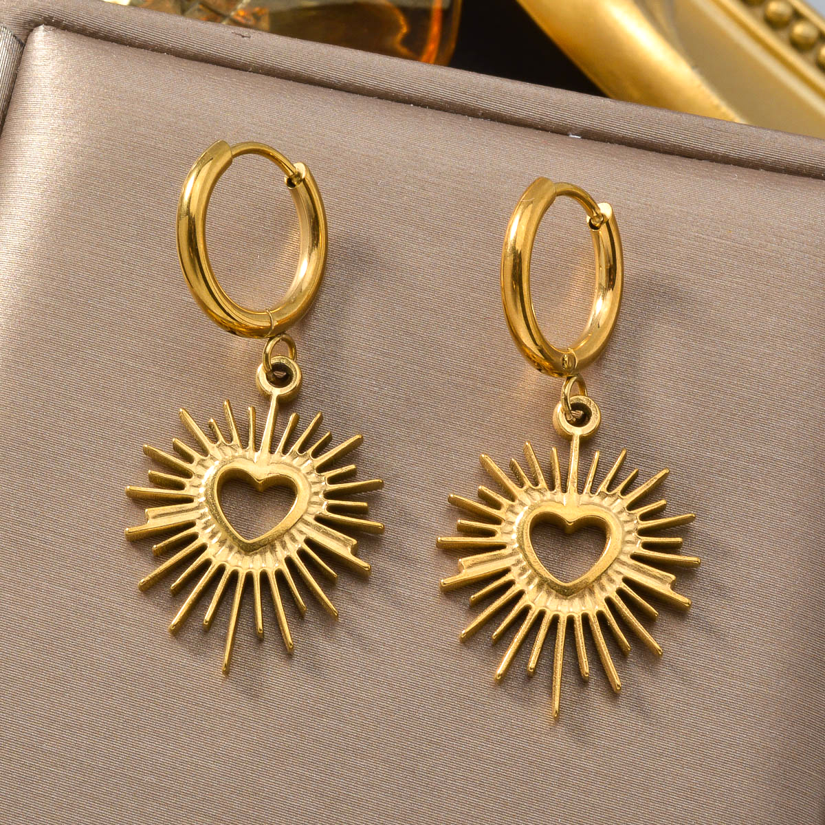 Based on the golden ring ear buckle, a chic pendant is hung below. The main body of the pendant is shaped like the sun's light, with lines diverging outward and full of vitality. There is also a hollow-out heart-shaped design embedded in the middle, which skillfully combines the enthusiasm of sunshine with the gentleness of love, the overall style is exquisite and full of design sense, which can add elegance and romance to the wearer.